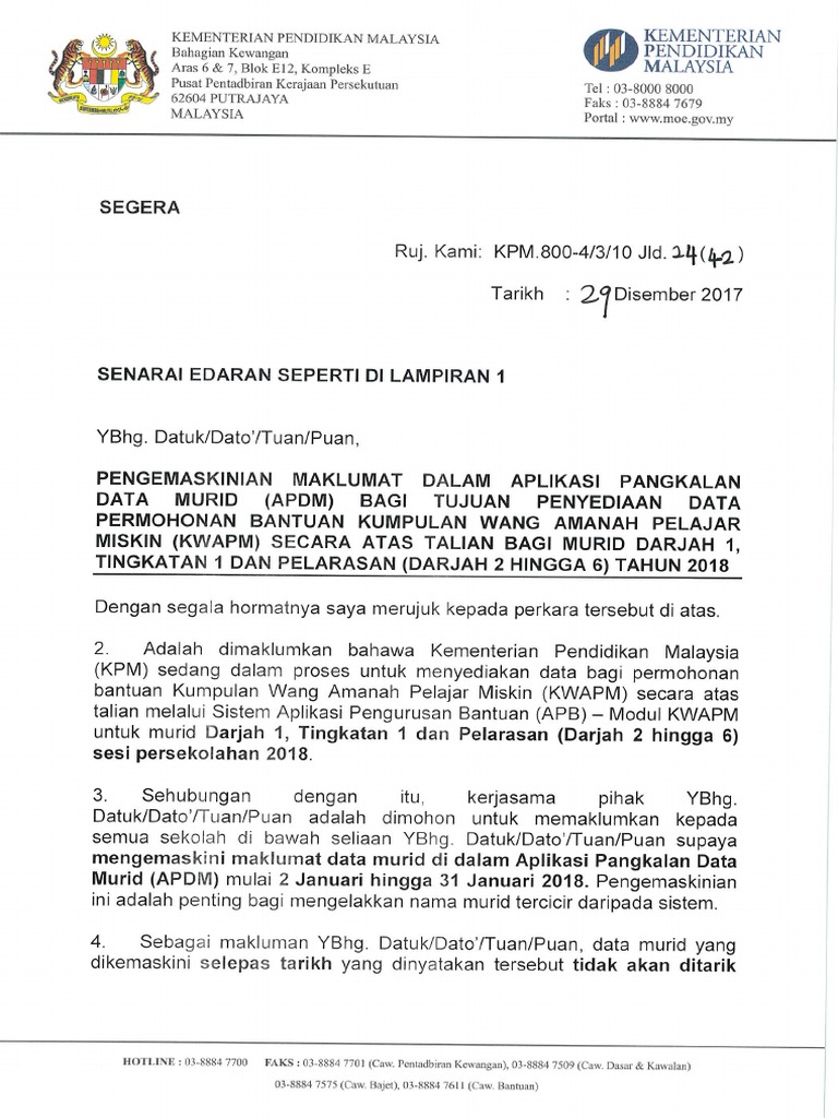 Link untuk akses ke Login APB biasiswa sukan telah diwujudkan dalam APDM di bawah. SPK BIL 1 2018 Bantuan Kumpulan Wang Amanah Pelajar Miskin KWAMP pdf 780 MB 15535 downloads Popular. Menurut Kementerian Pendidikan Malaysia KPM kemiskinan merupakan punca utama keciciran sekolah.